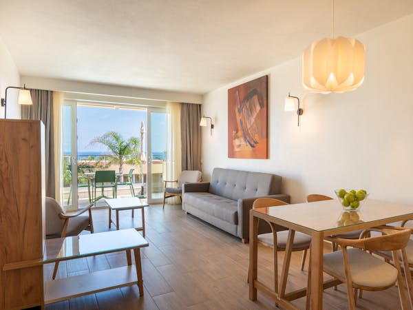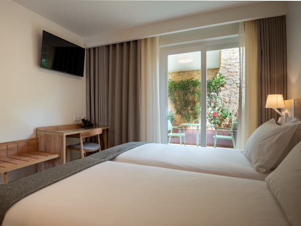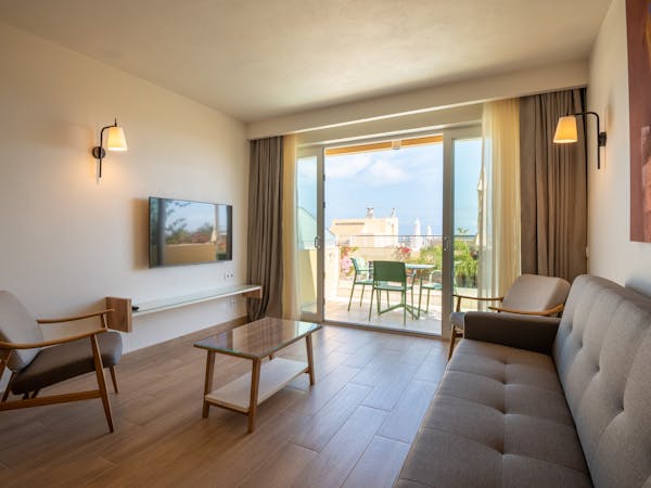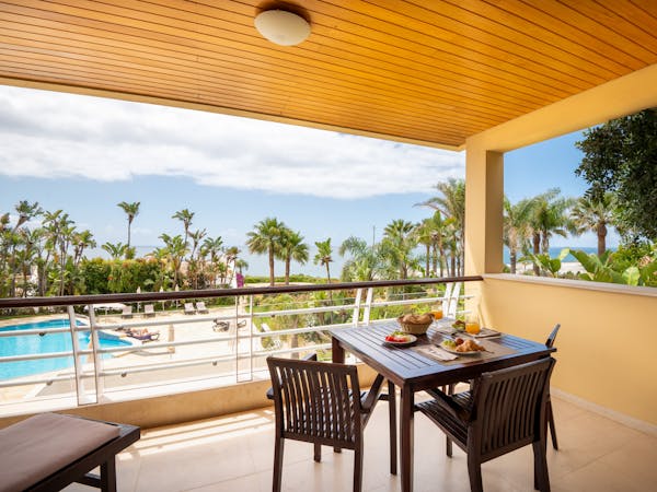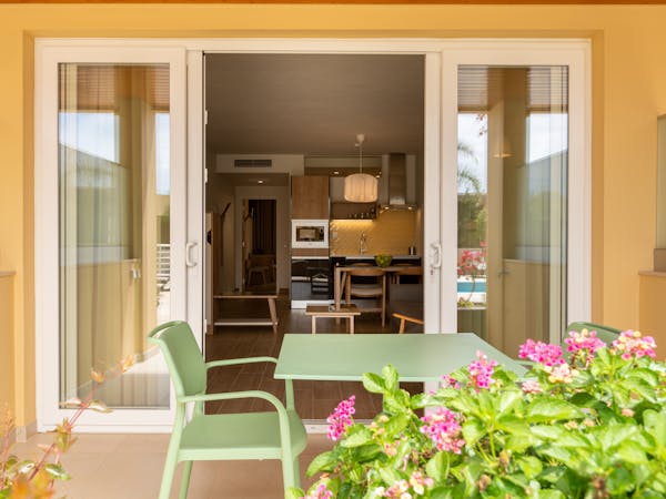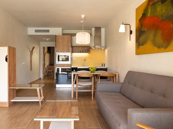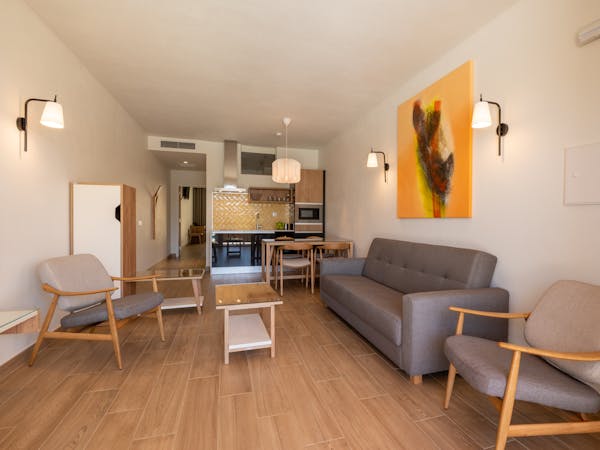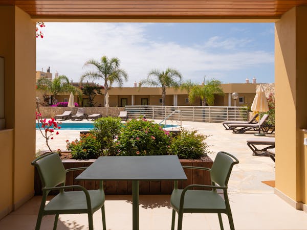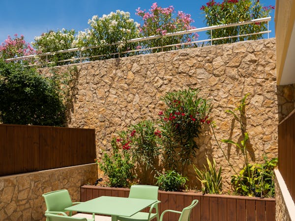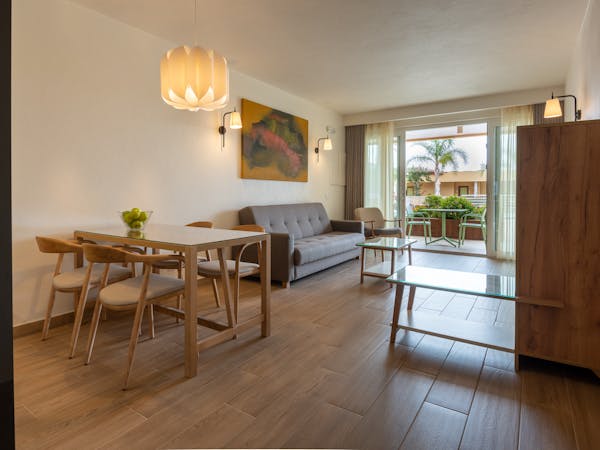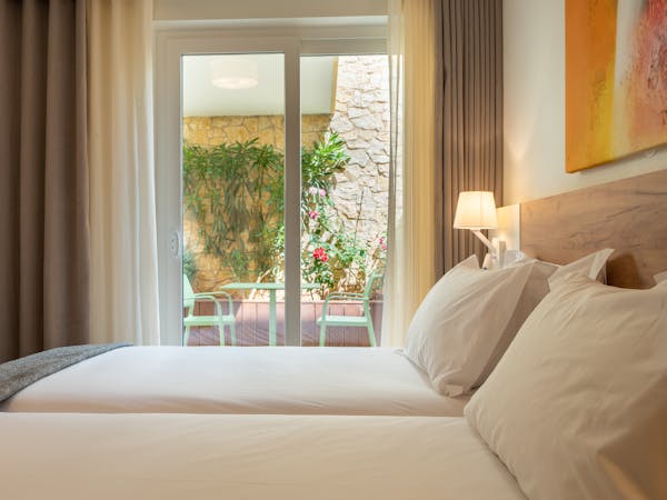 When booking, you can choose between apartments with sea views located on the first floor with independent access from the hotel and apartments with pool views and direct access to the pool, which also stand out for their interior patio with access from the bedroom.